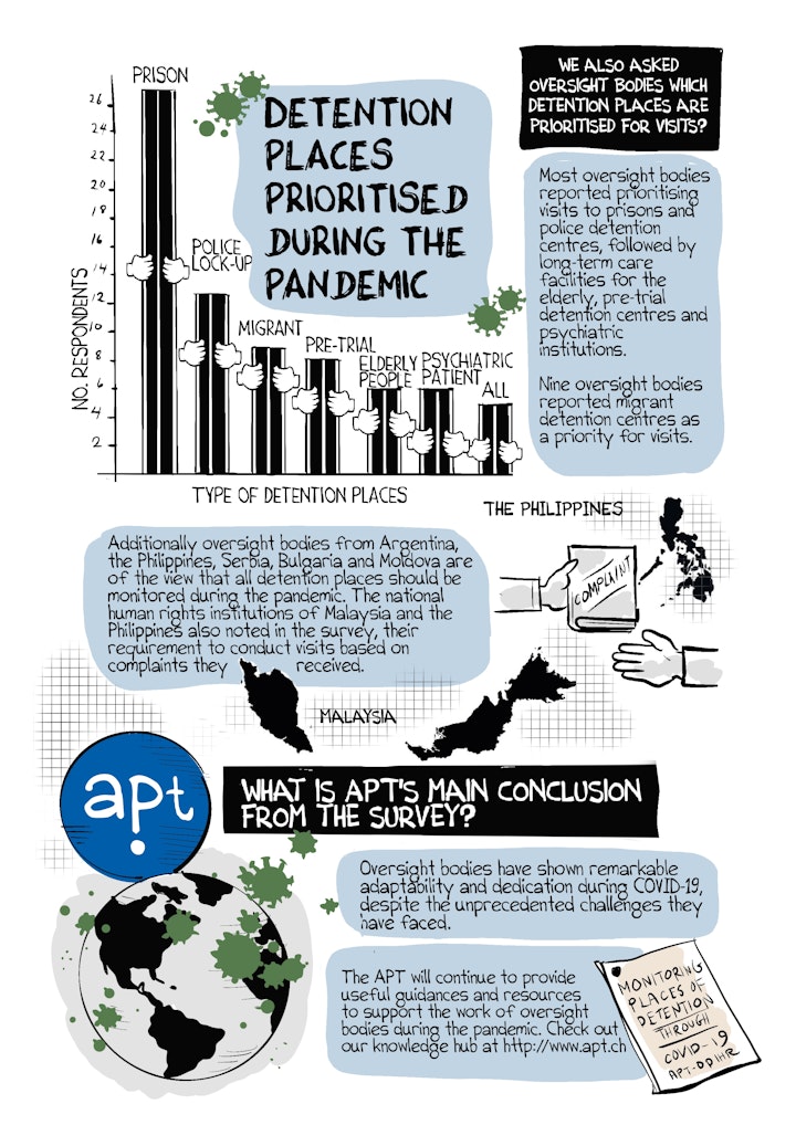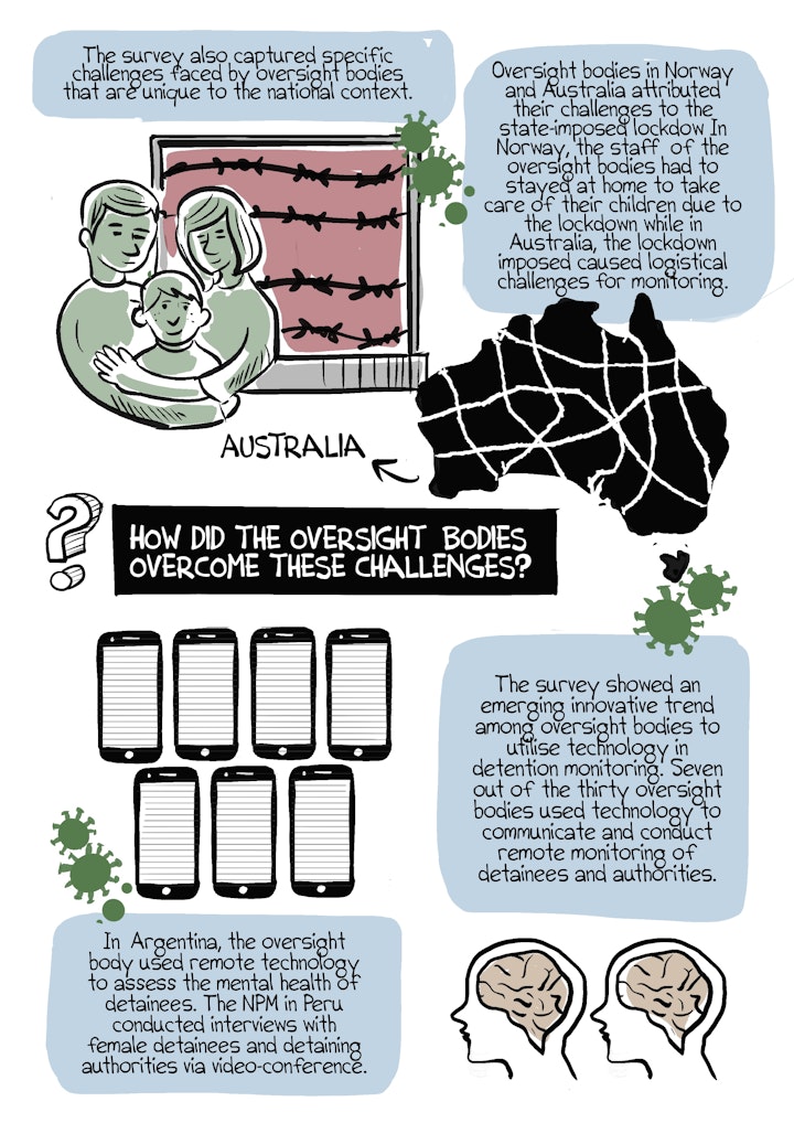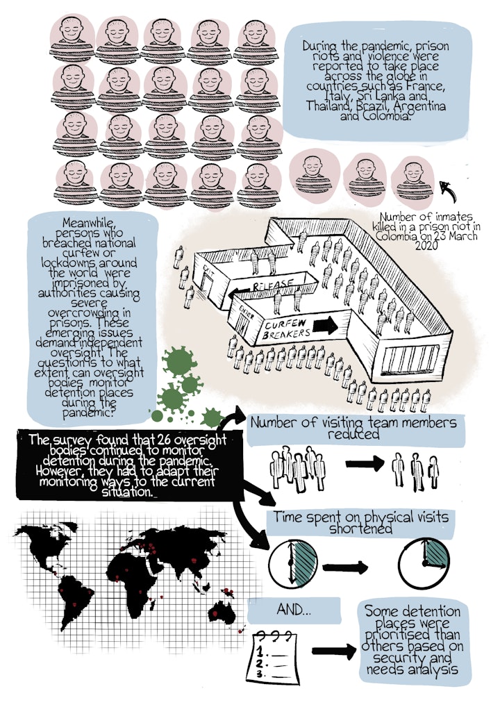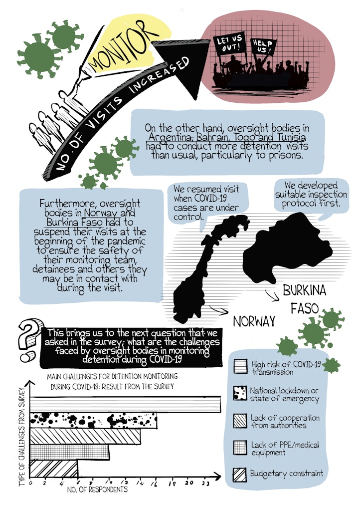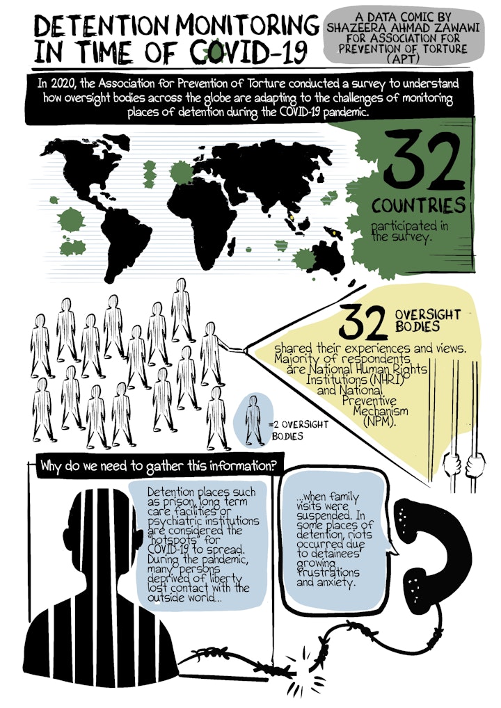 Last year, my organisation conducted a short survey among oversight bodies around the world on how they are adapting their work and coping with the challenges posed by COVID-19. 32 oversight bodies consisting of national human rights institutions and national preventive mechanisms ( oversight bodies that state parties to the U.N Optional Protocol to Convention against Torture are obligated to establish) responded to the survey. I drew this datacomic to visualise the main insights identified from the survey.