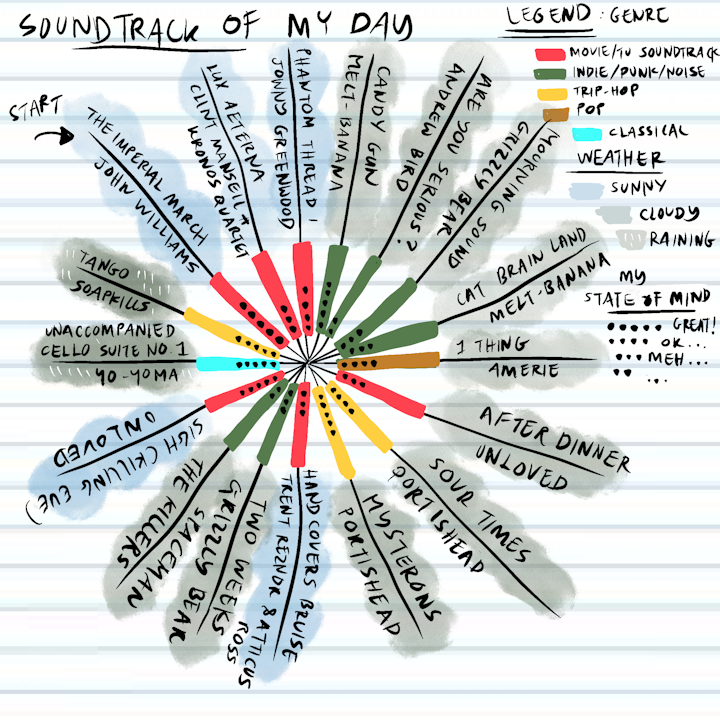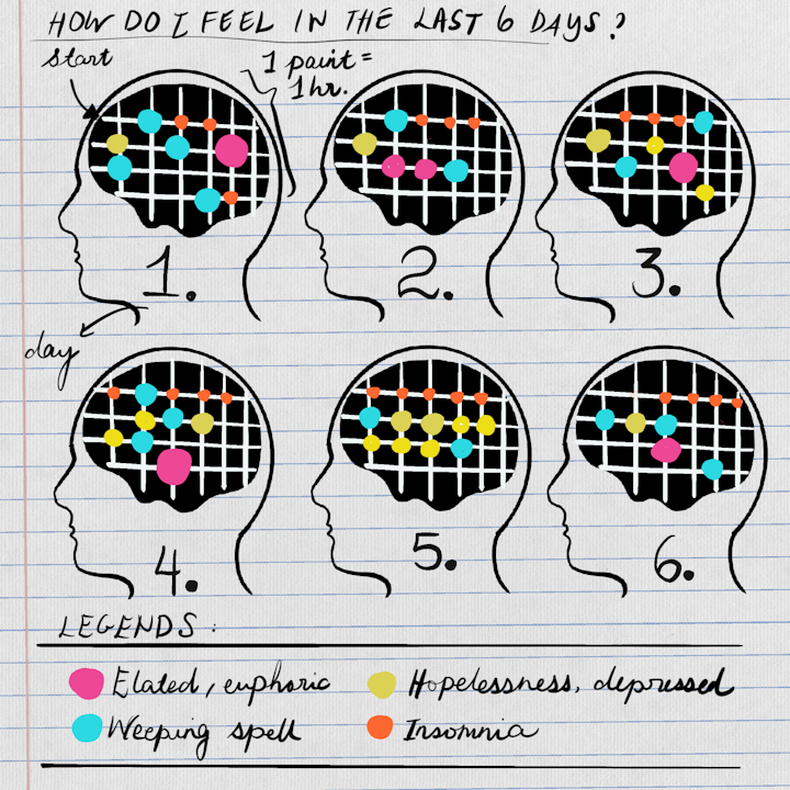 It was World Mental Health Day 2020 and The Pixies” Where is My Mind” was playing in my head. I drew this self-portrait of a day in my normal life with Procreate.