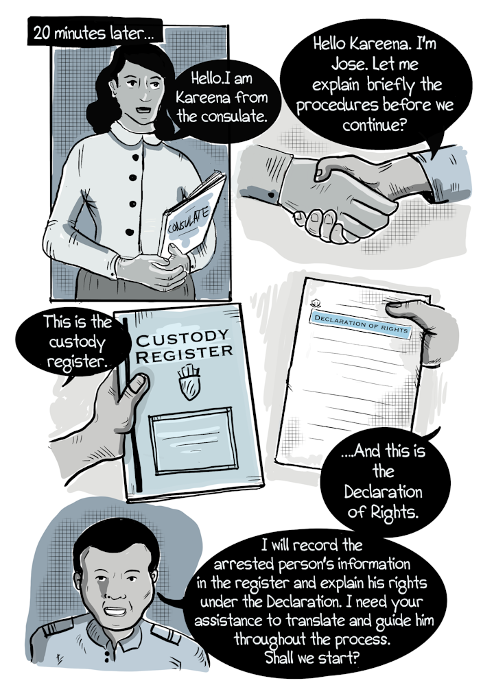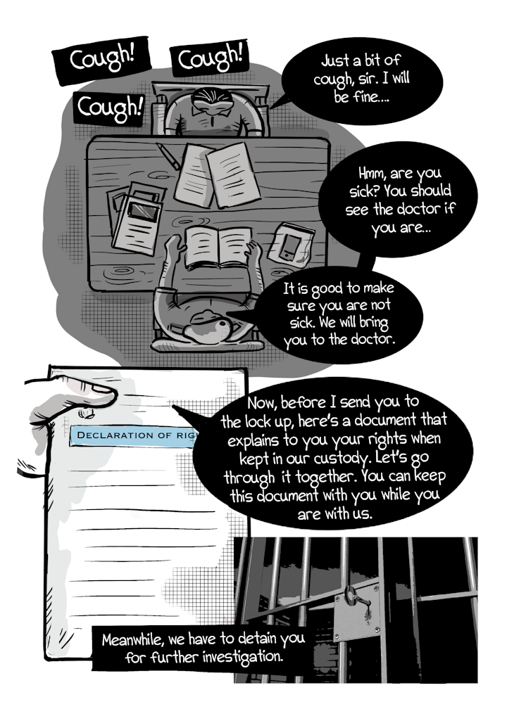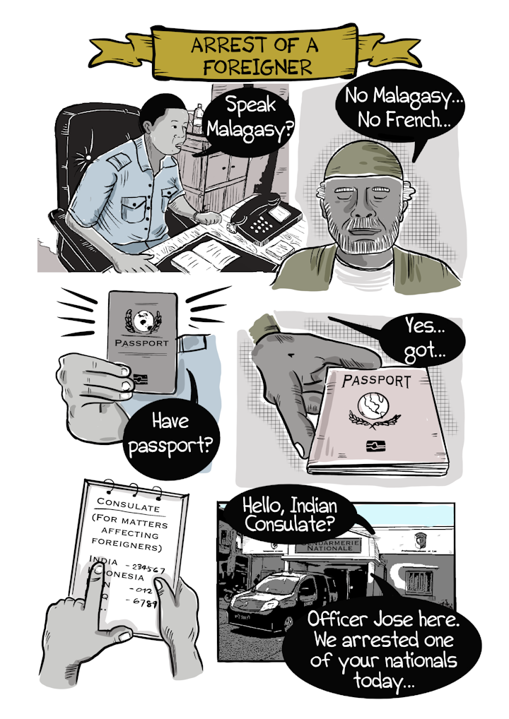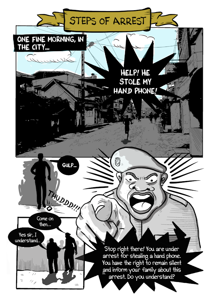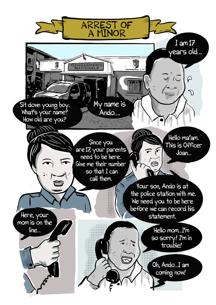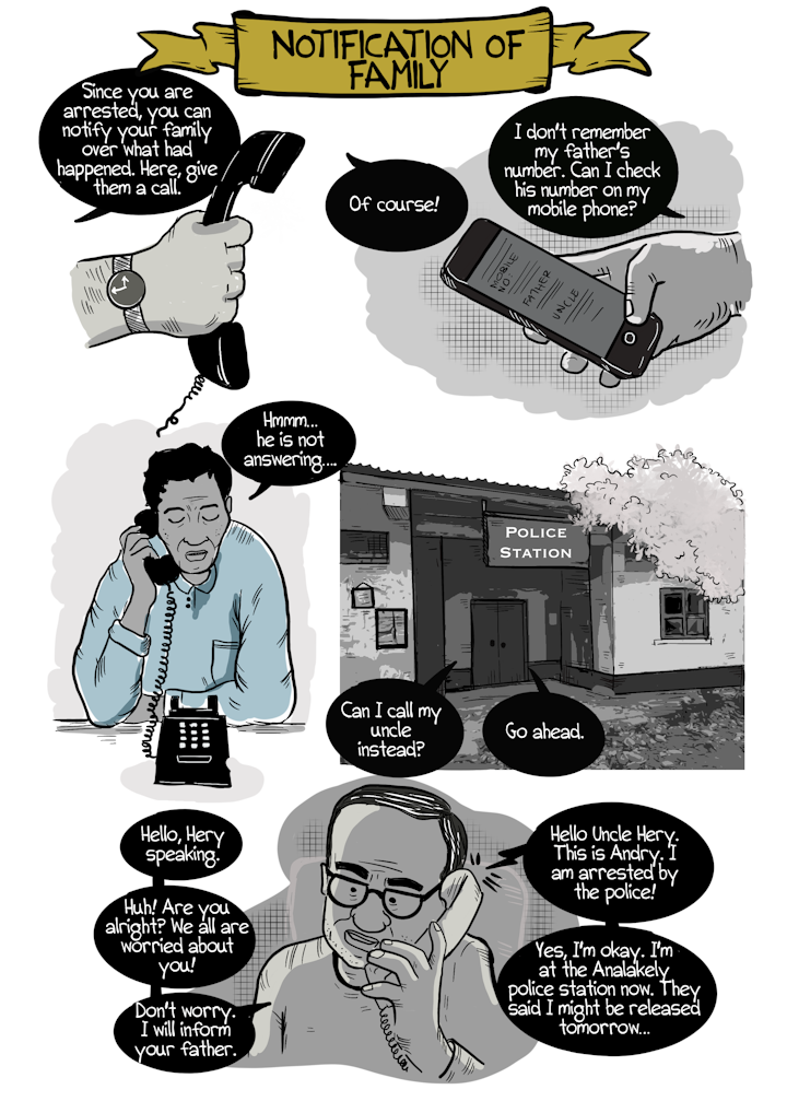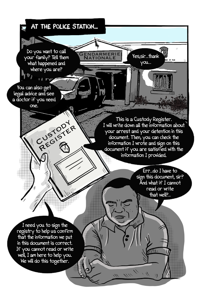 In 2020, I was tasked by  the APT to develop comics that explain concisely the rights of the persons deprived of liberty and how the police should ensure these rights from the moment of arrest.  The comics are part of the national handbook developed by the APT and the National Police Force of Madagascar to educate police officers on this topic.