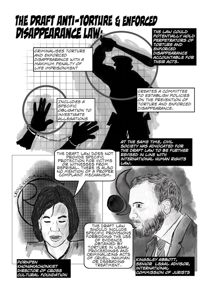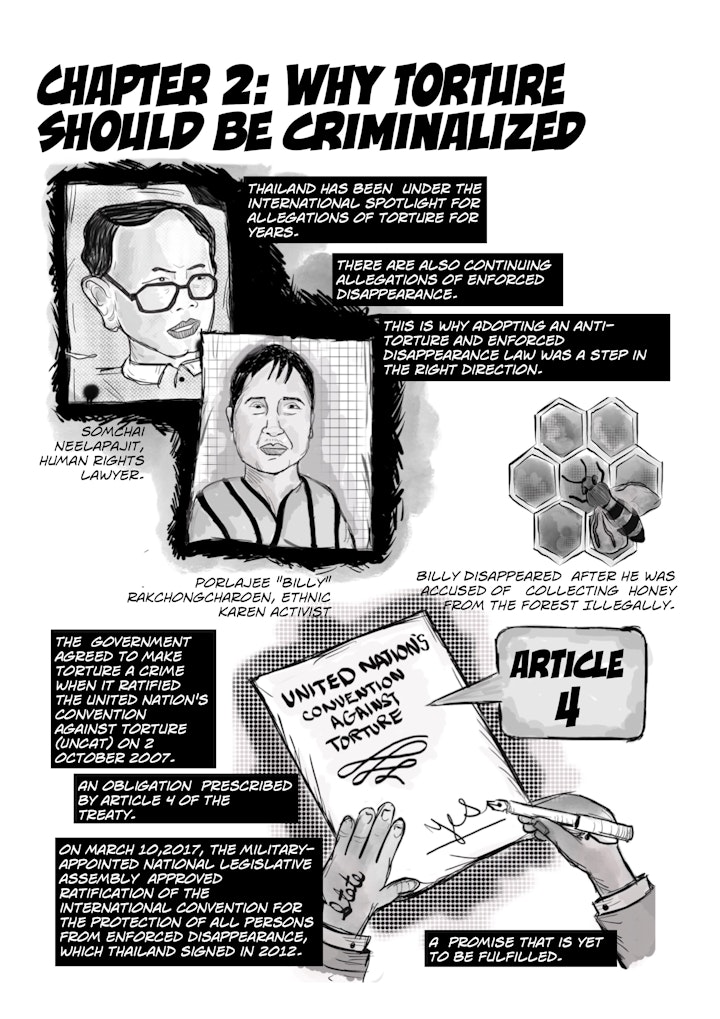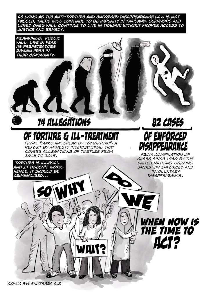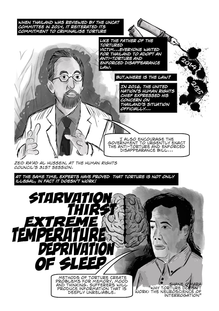 This docucomic was a labor of love and passion. While I work on the storyline and the illustration, NGOs in Thailand; Crosscultural Foundation, International Commission of Jurist (ICJ) and Amnesty International Thailand were really the backbone of the story I drew. The docucomic was published online on 26 June 2017, in conjunction with the International Day to Commemorate Victims of Torture. It was also featured on the Thai PBS Newschannel on 27 June 2017 as an infographic to explain the issue of torture and ill-treatment in Thailand.