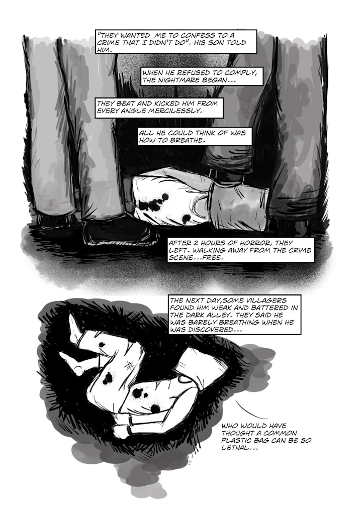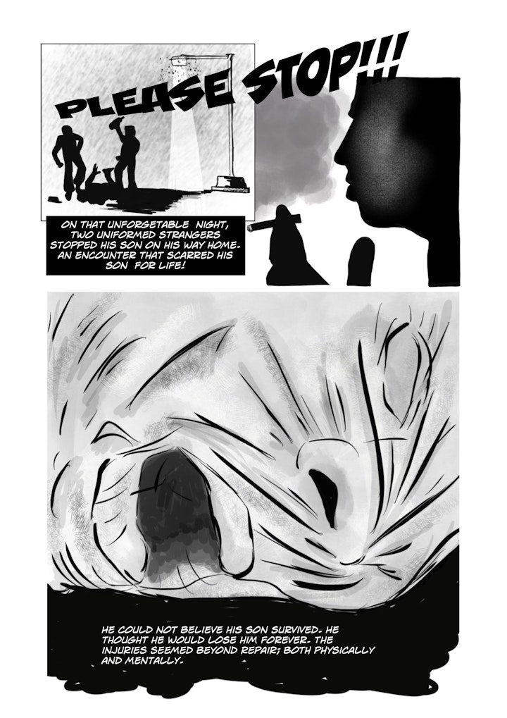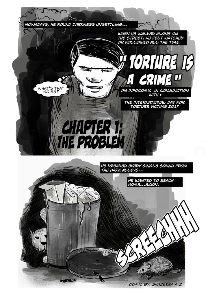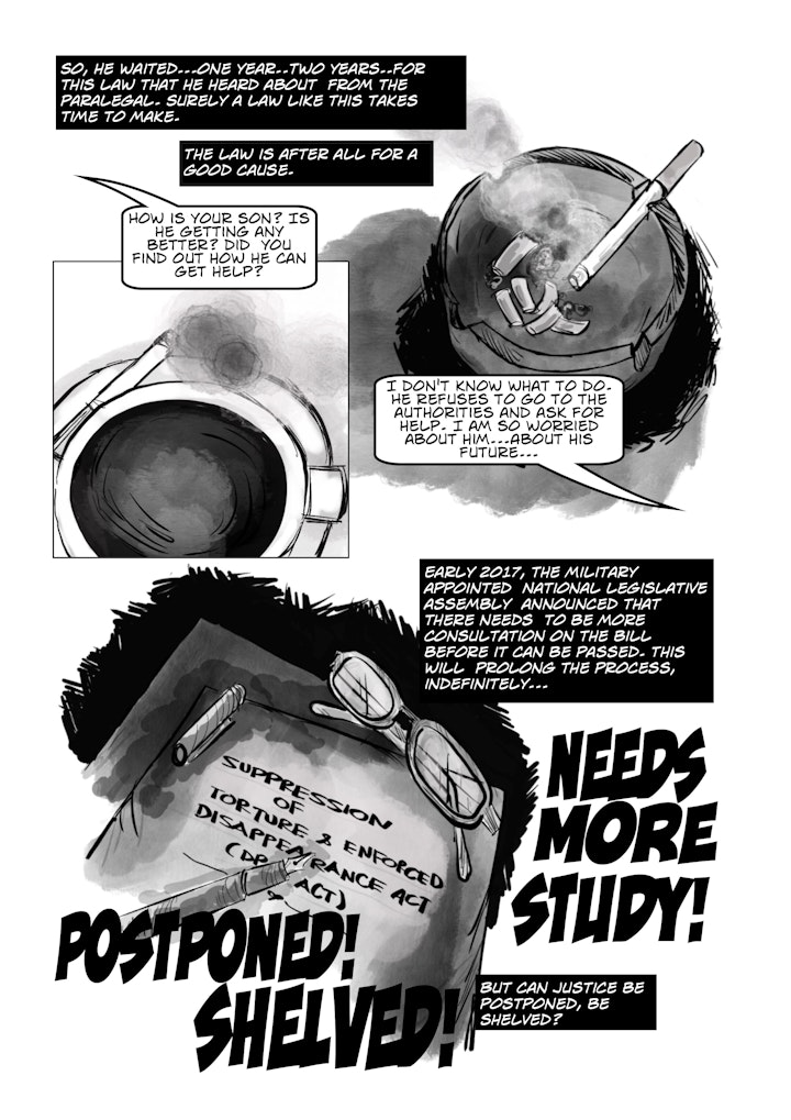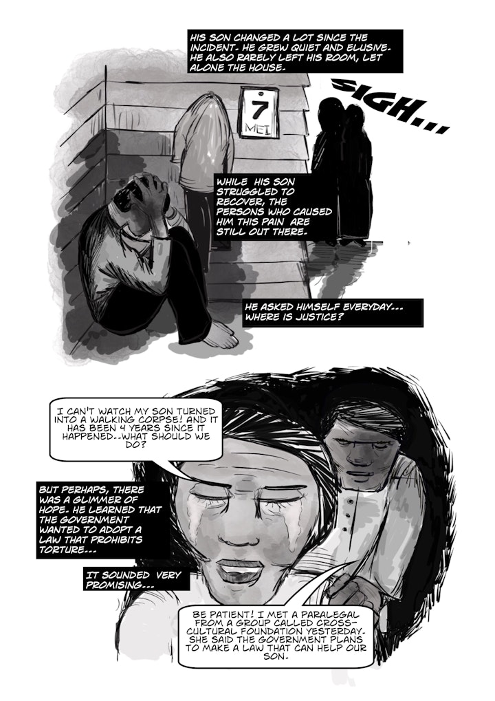 This docucomic was a labor of love and passion. While I work on the storyline and the illustration, NGOs in Thailand; Crosscultural Foundation, International Commission of Jurist (ICJ) and Amnesty International Thailand were really the backbone of the story I drew. The docucomic was published online on 26 June 2017, in conjunction with the International Day to Commemorate Victims of Torture. It was also featured on the Thai PBS Newschannel on 27 June 2017 as an infographic to explain the issue of torture and ill-treatment in Thailand.