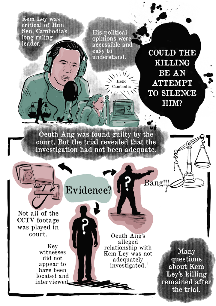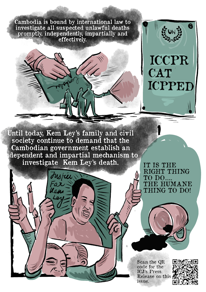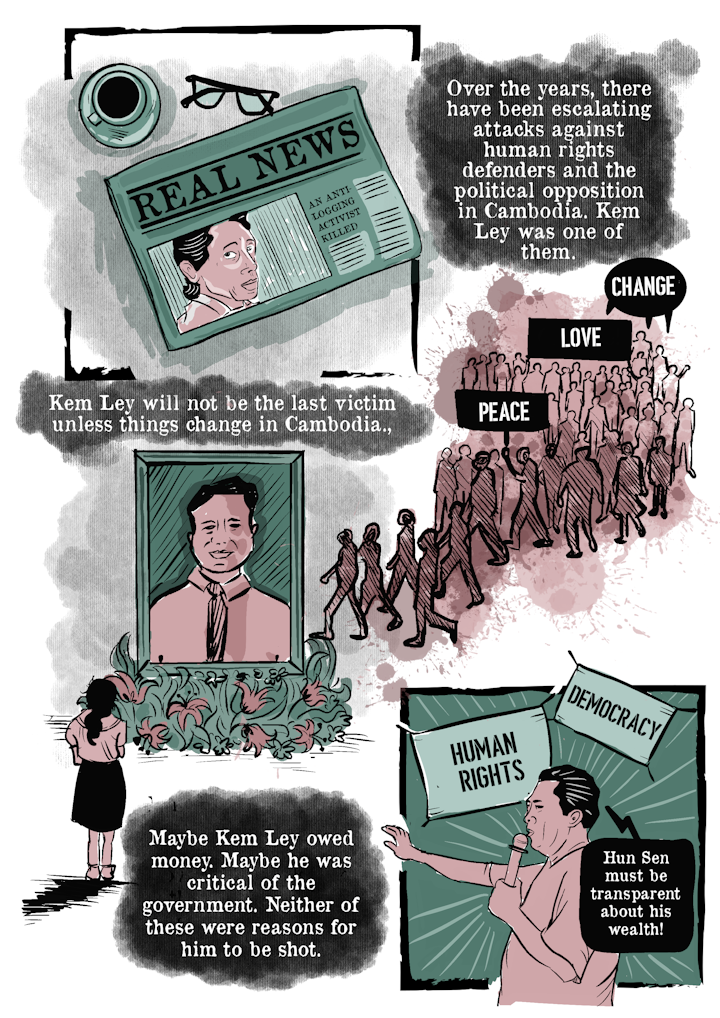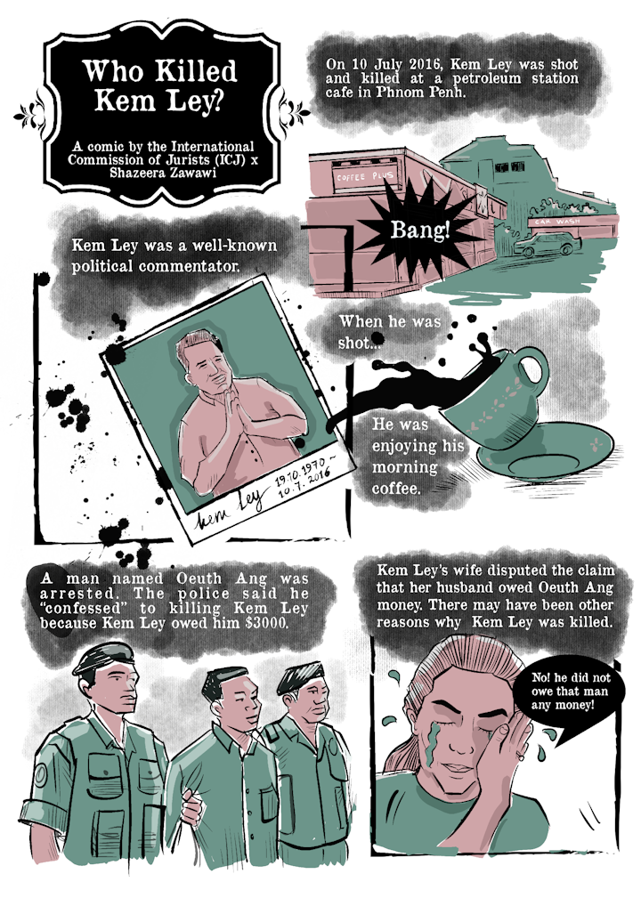 In 2022, I was commissioned by the International Commission of Jurists (ICJ) to draw a comic about the fate of Cambodian activist, Kem Ley who was assassinated due to his influential work and activism in the country. The story was developed collaboratively with the ICJ lawyers and was based on the reports and public statements issued by the organisation on this case.
